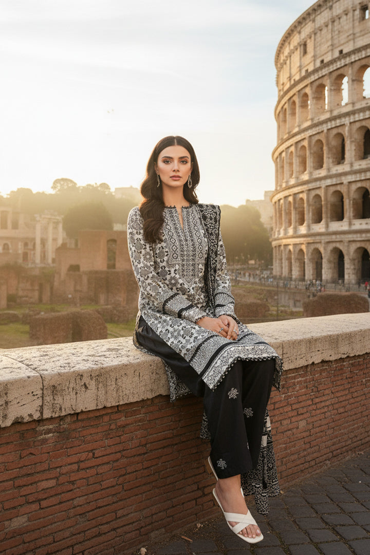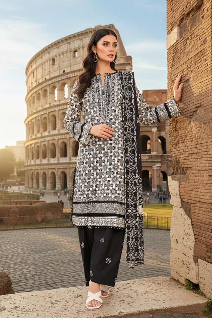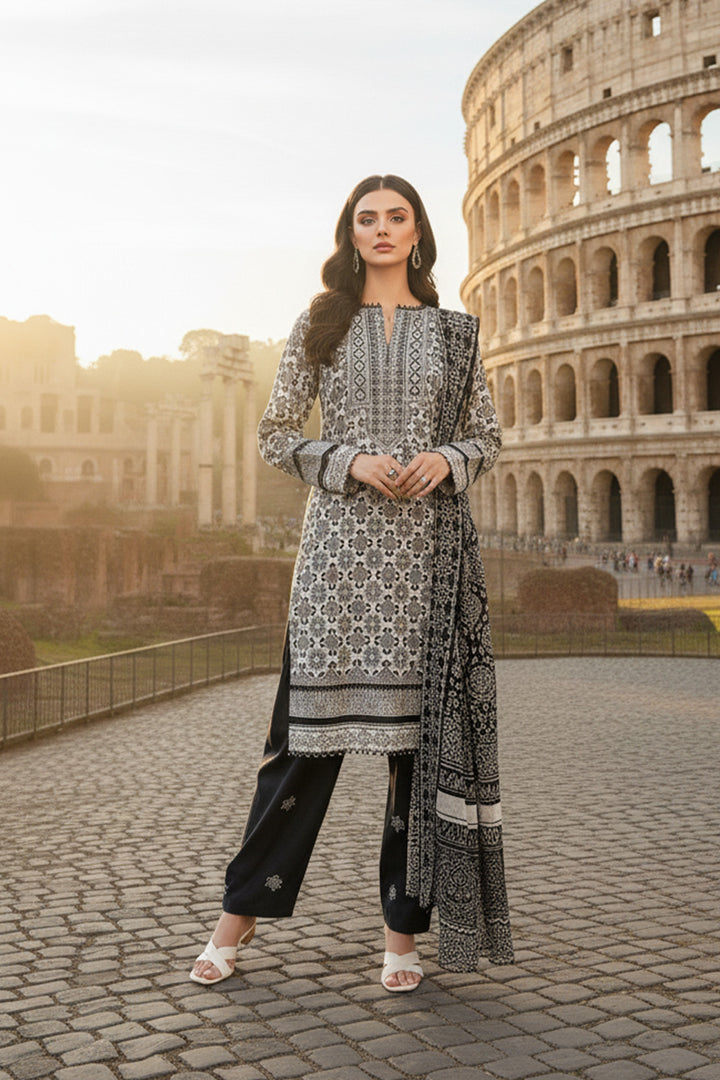 Upgrade your winter fashion with our three-piece embroidered shirt, trousers and dupatta.