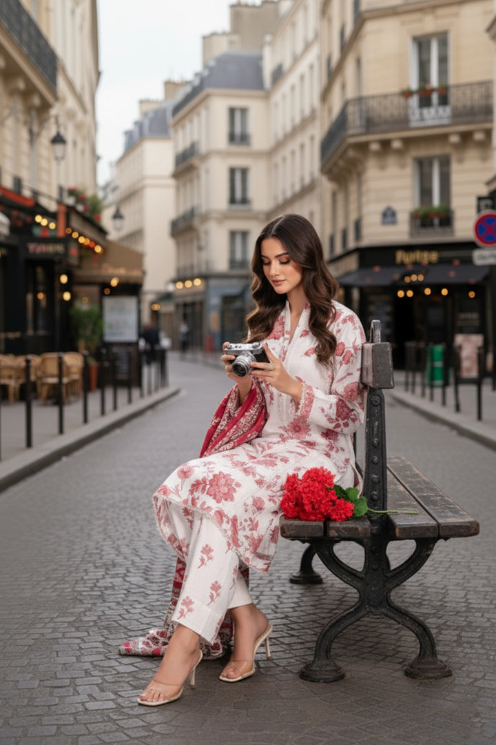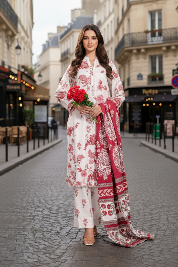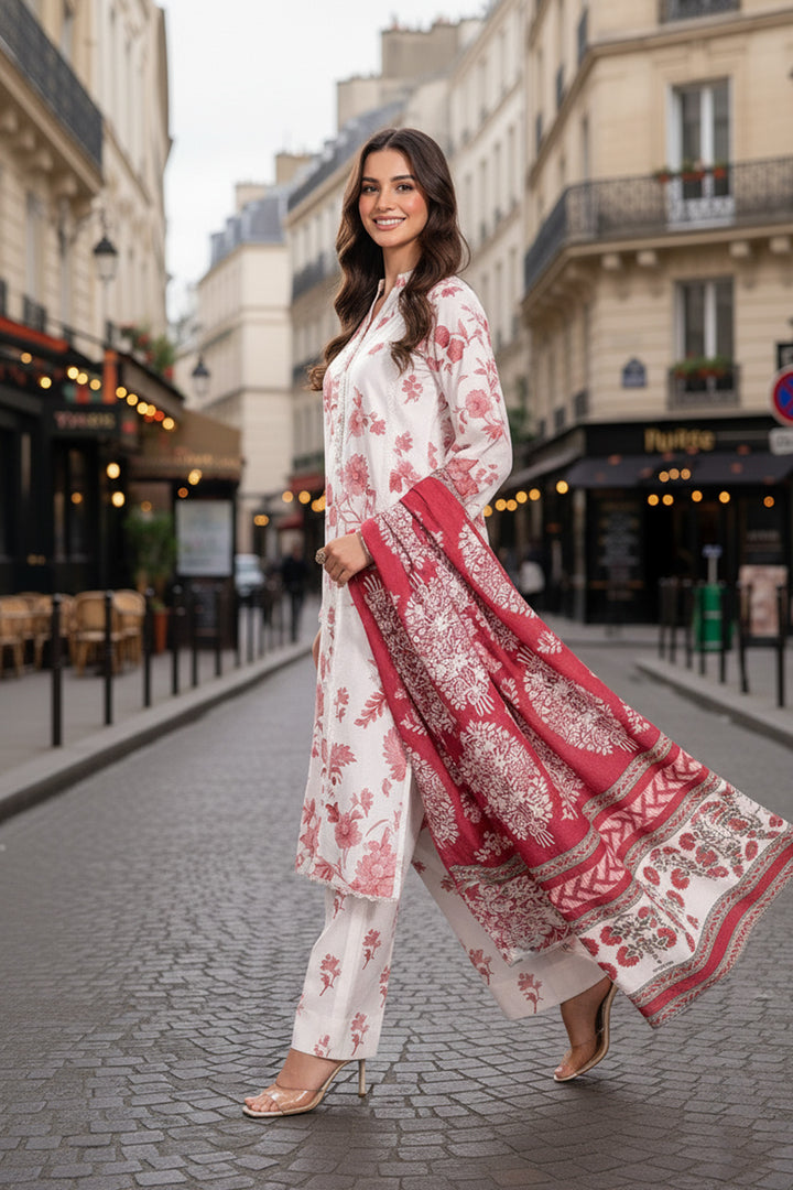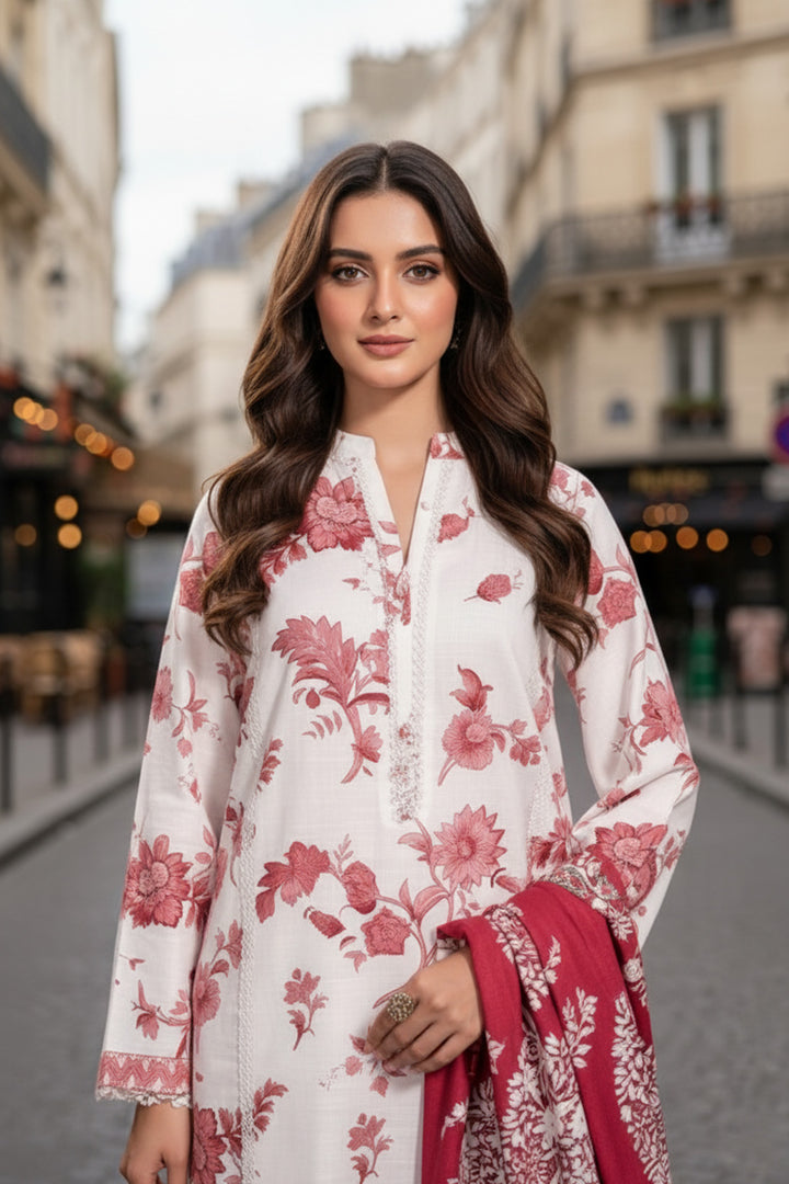 Amp up your winter fashion with our three-piece printed khaddar shirt, trouser and dupatta.