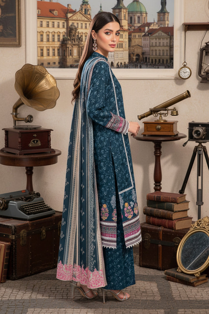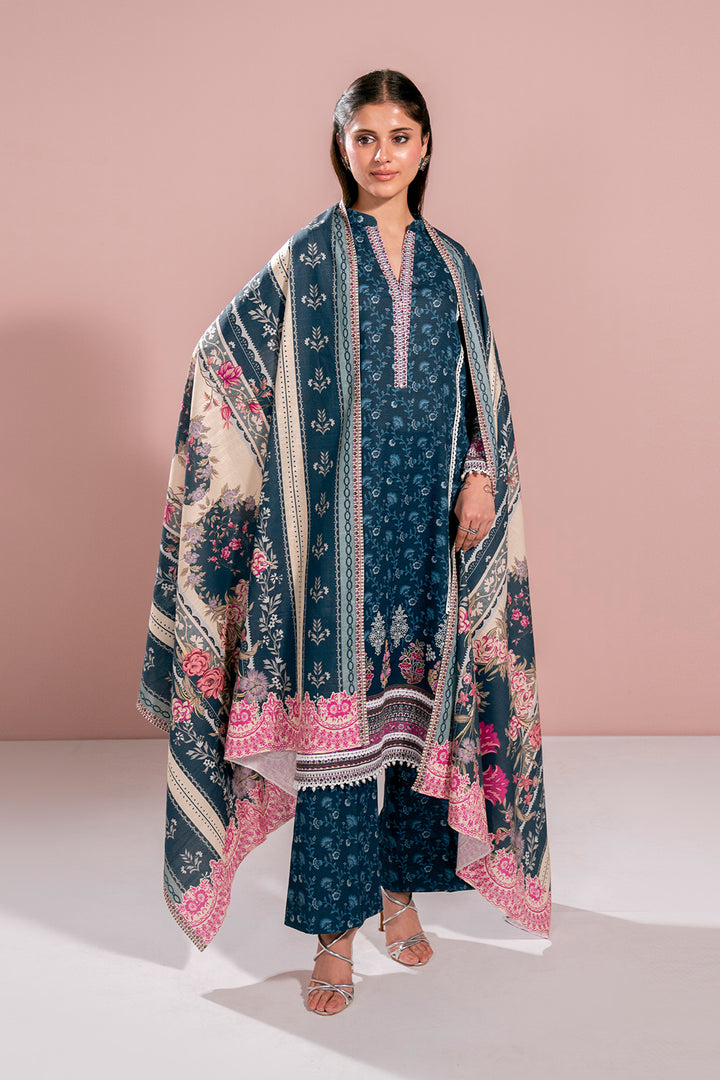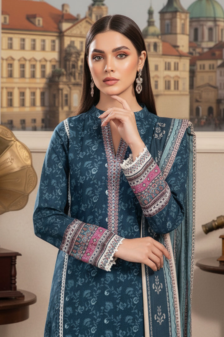 Curate the perfect winter outfit with our three-piece printed khaddar suit.