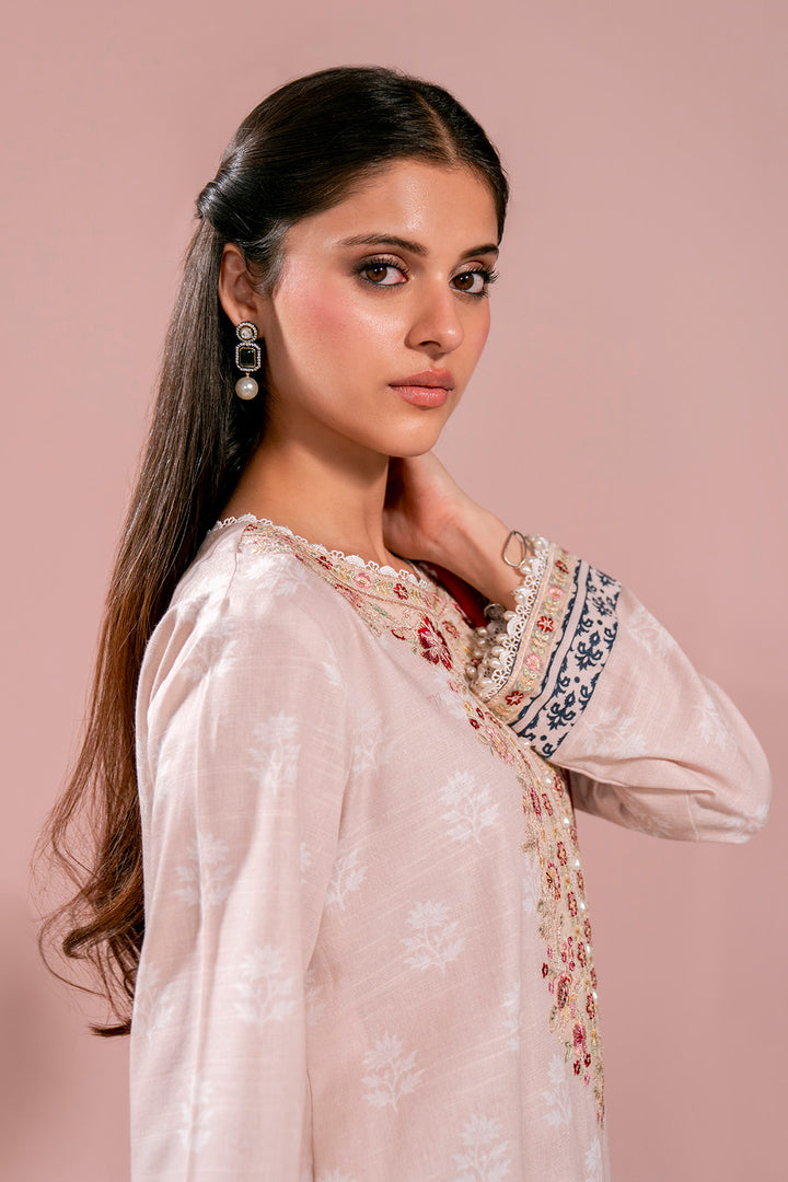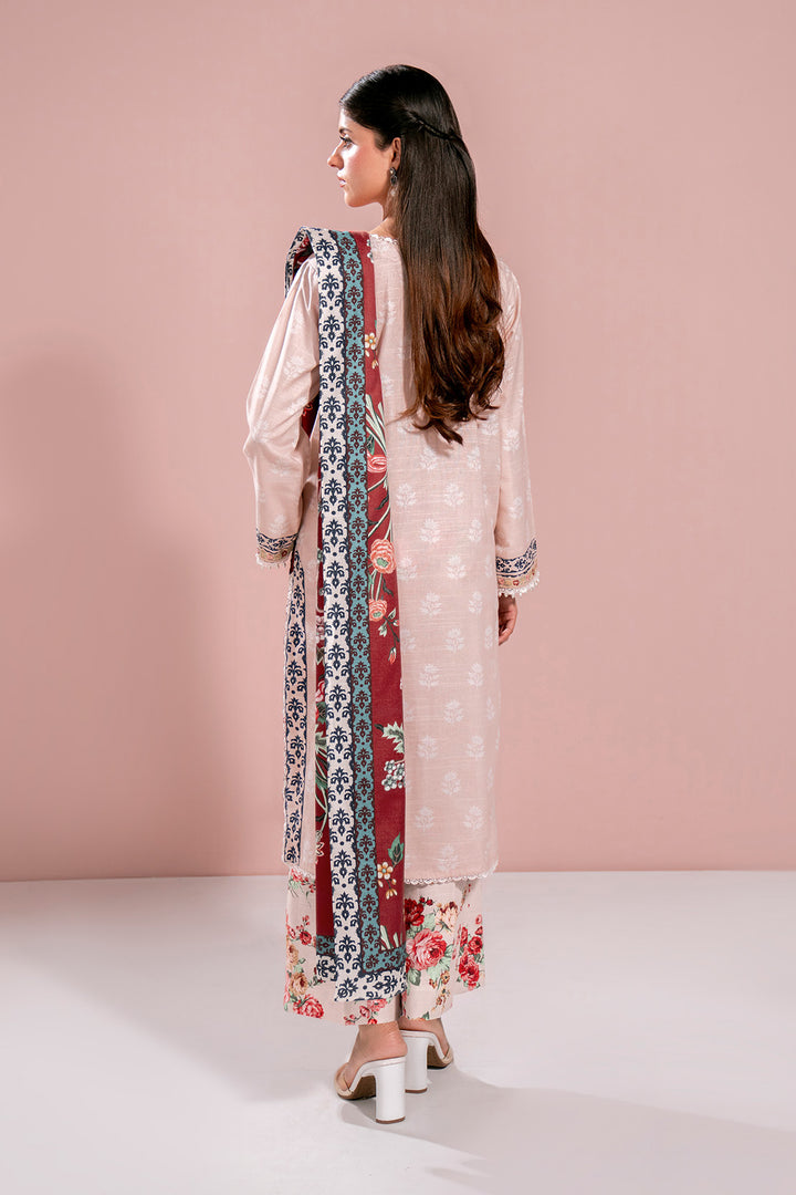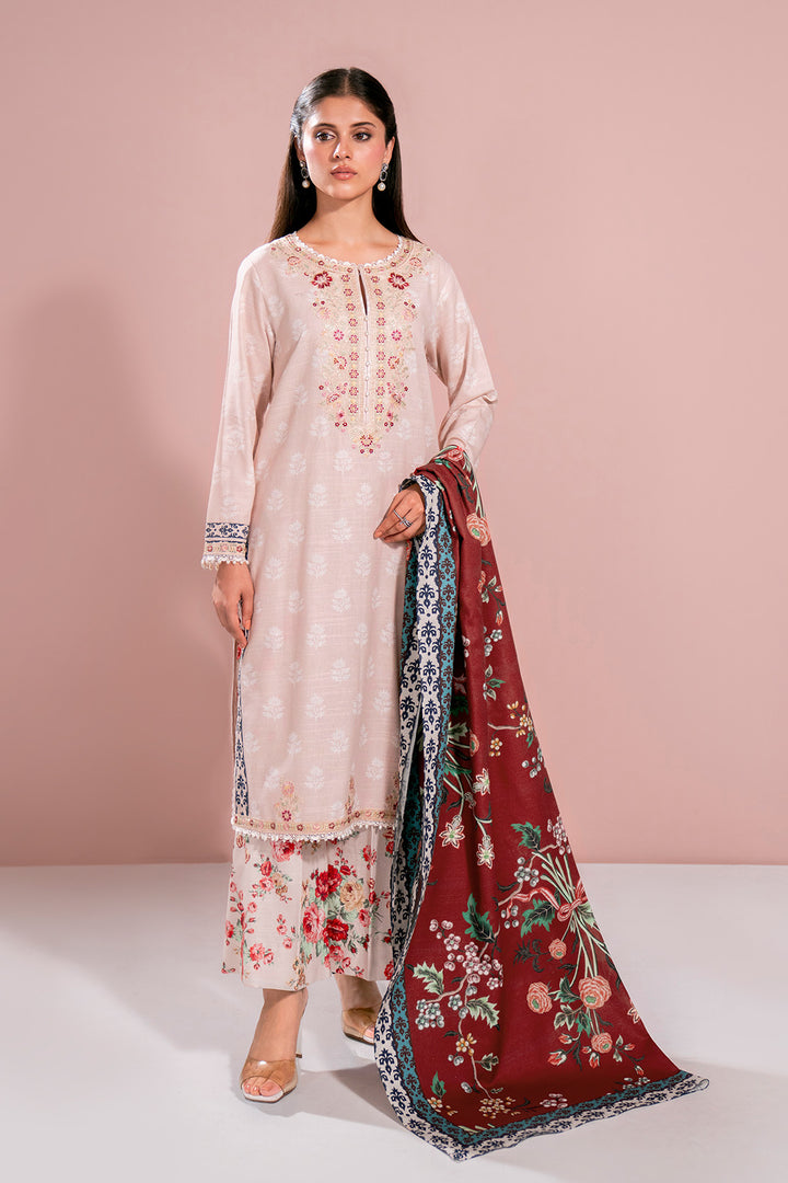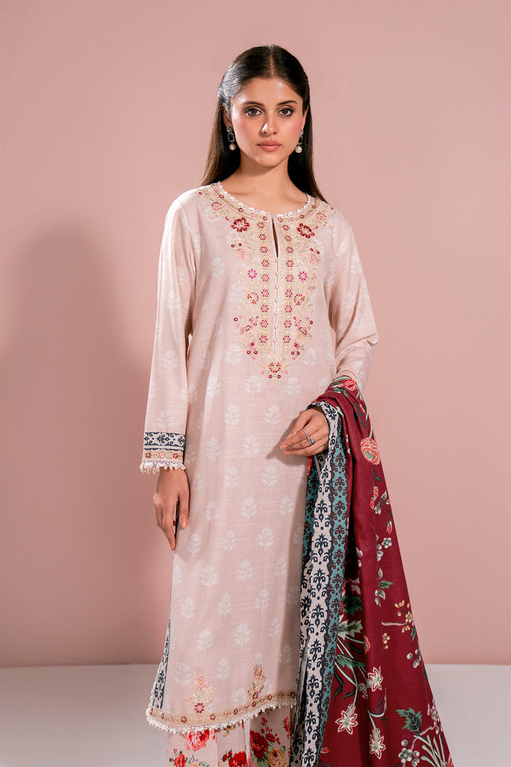 Amp up your winter fashion with our three-piece printed embroidered khaddar shirt and Dupatta with printed trousers.