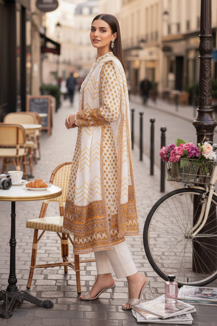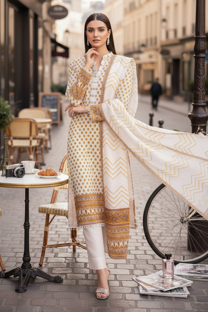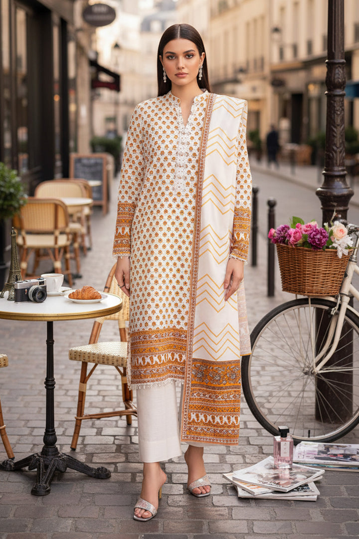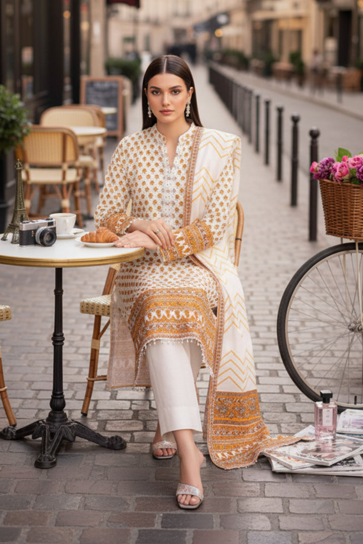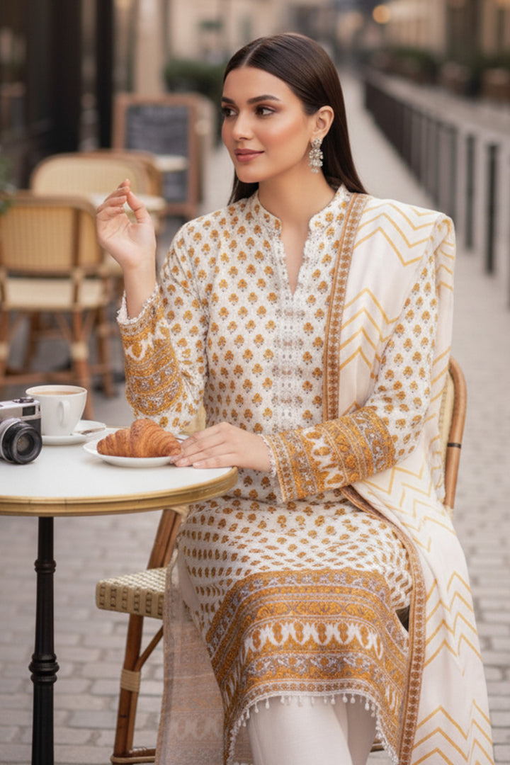 Upgrade your seasonal wardrobe in our printed three-piece featuring a warm khaddar shirt, dupatta and solid trousers.
