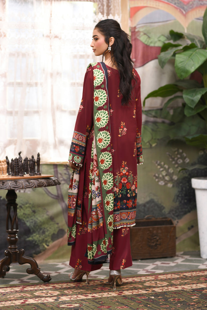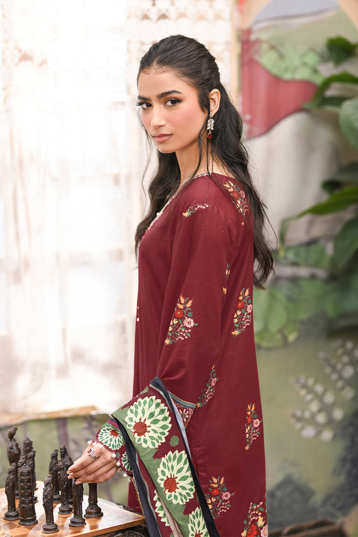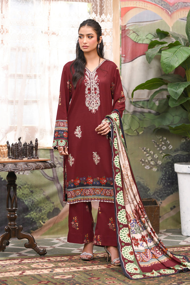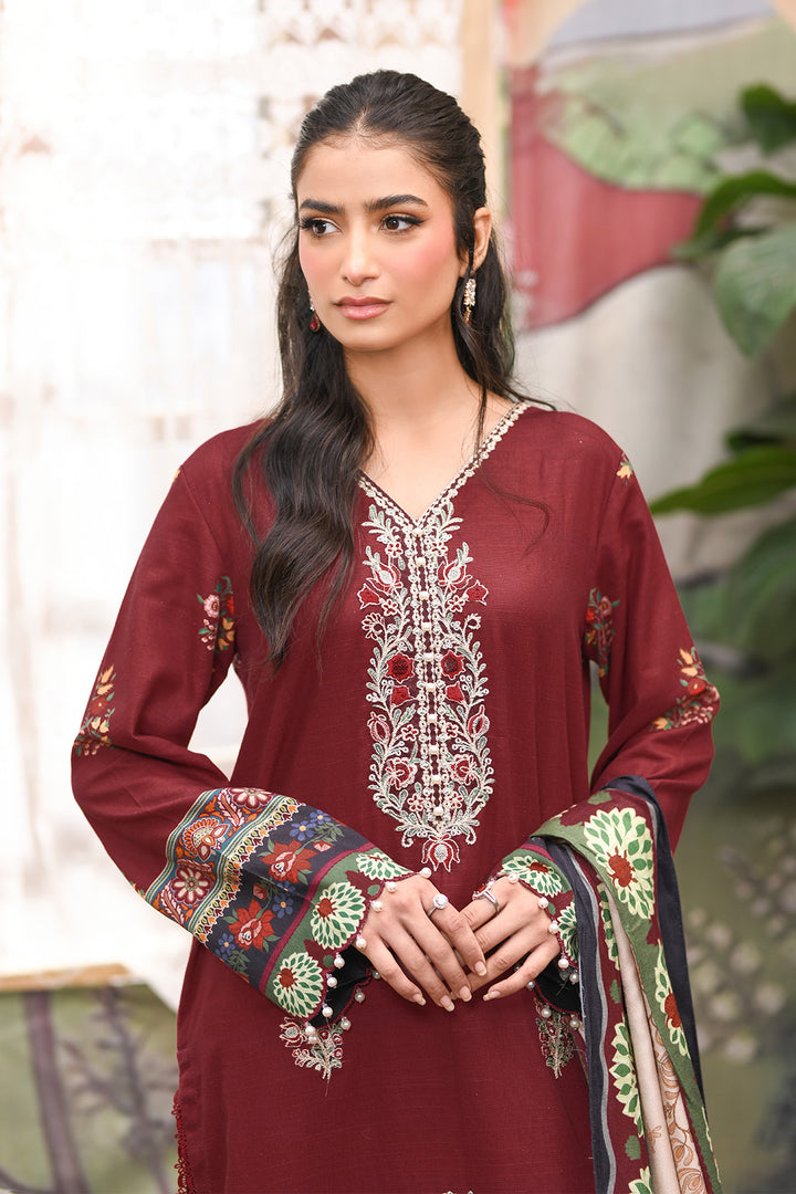 Step into winter with grace in our Printed embroidered three-piece including a khaddar shirt, trousers and warm twill shawl.