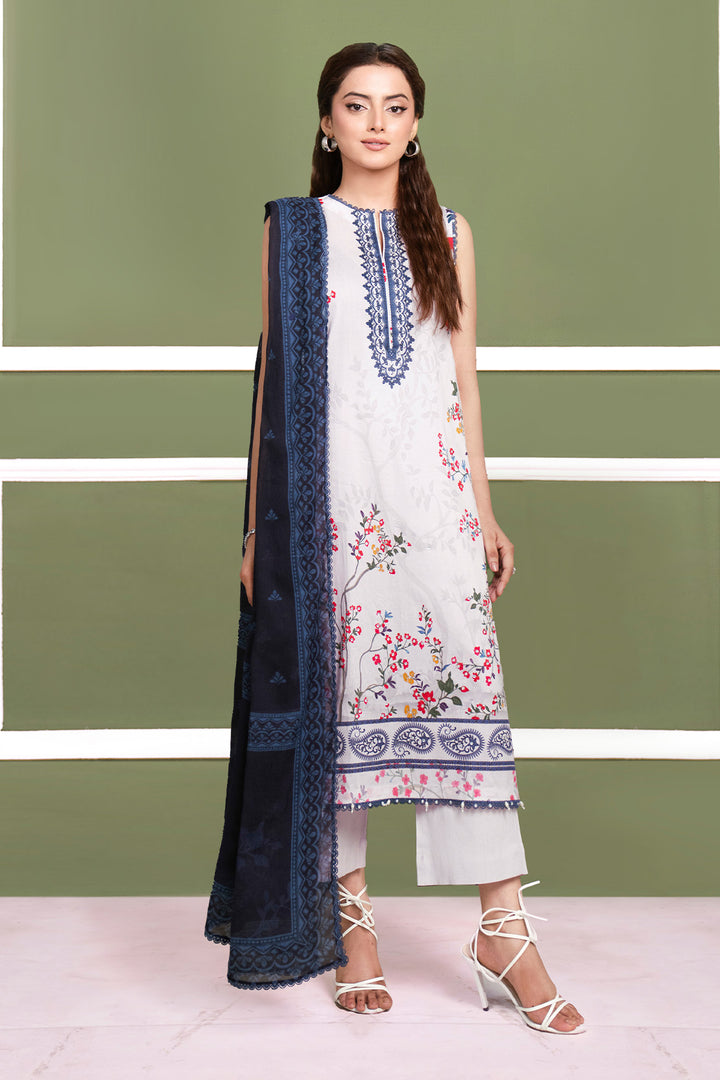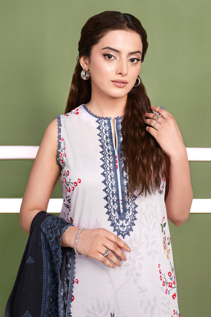 Make a statement with our subtle ensemble, featuring a 3 - Piece Suit - Cambric Printed shirt paired with a printed lawn dupatta and dyed cambric trousers.