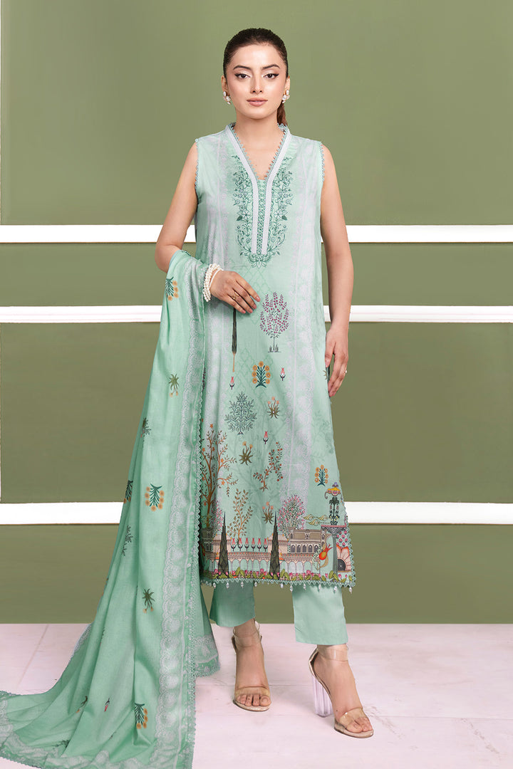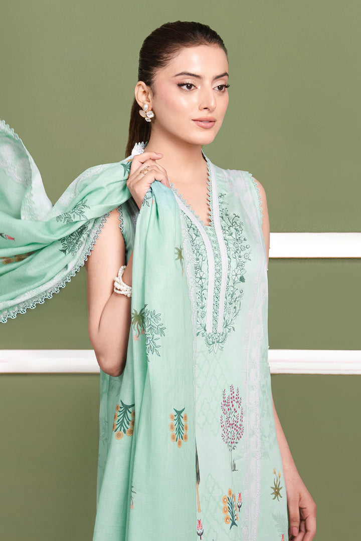 step up your style game with our soothing printed ensemble, featuring a 3 - Piece Suit - Cambric Printed shirt paired with a printed lawn dupatta and dyed cambric trousers.