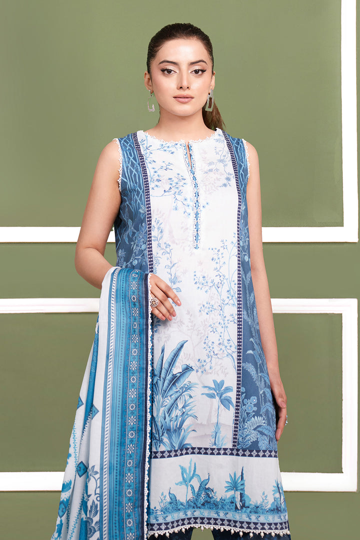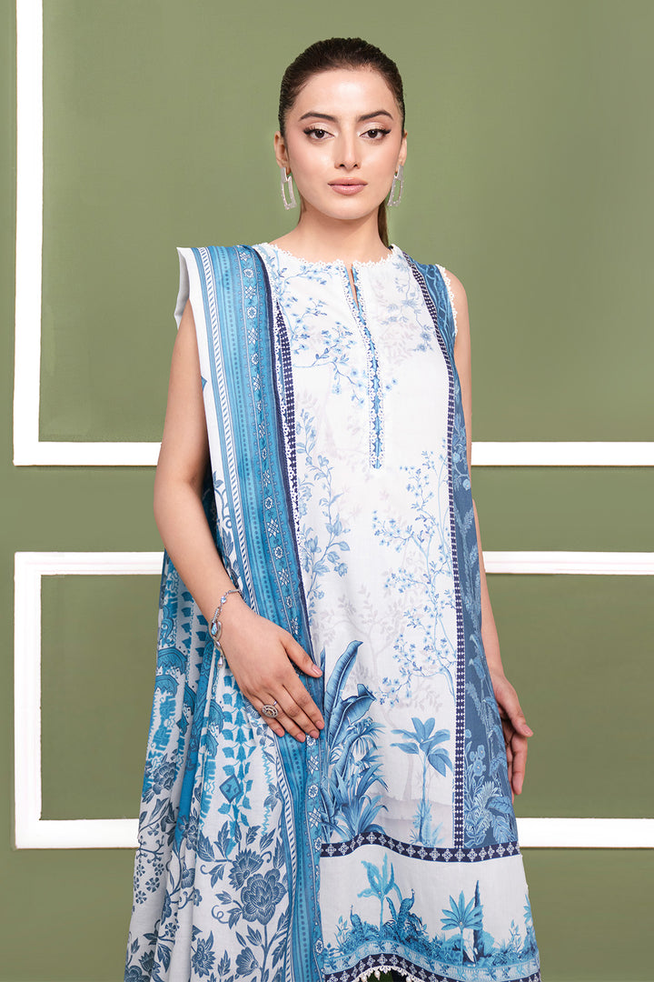 Elevate your style with our Lively printed ensemble, featuring a 3 - Piece Suit - Cambric Printed shirt paired with a printed lawn dupatta and cambric trousers.