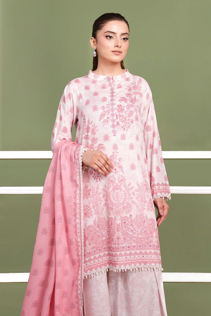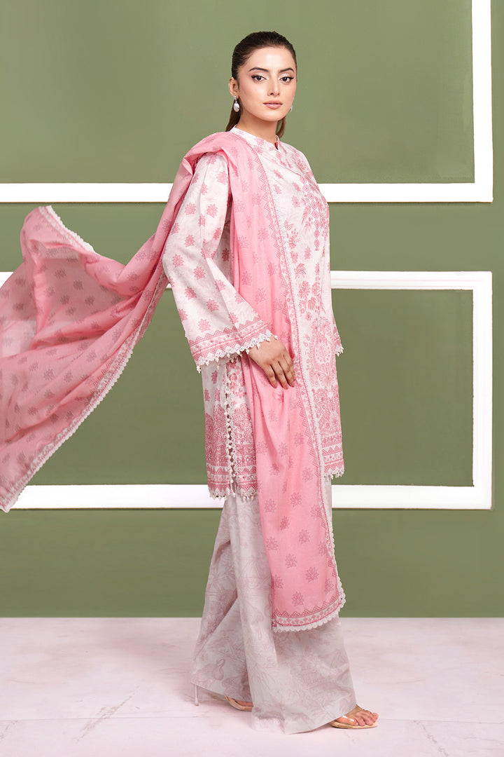 Elevate your style with our subtle printed ensemble, featuring a 3 - Piece Suit - Cambric Printed shirt paired with a printed lawn dupatta and cambric trousers.