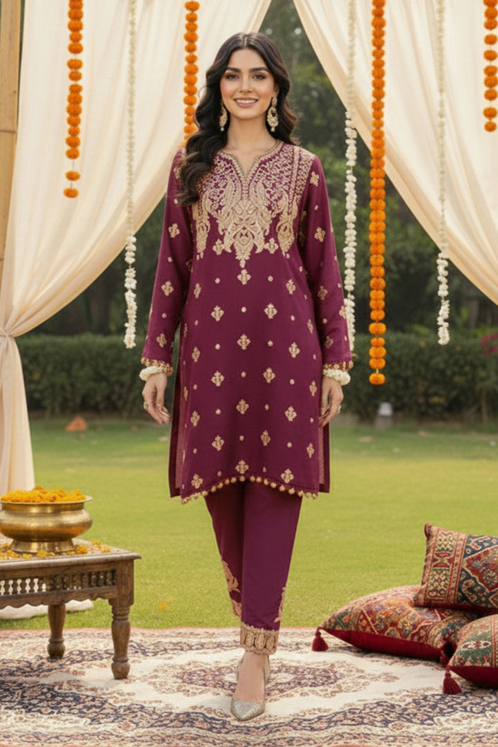 Turn heads this season in our two-piece embroidered raw silk ensemble featuring an exquisite color palette with rich embroidered patterns.