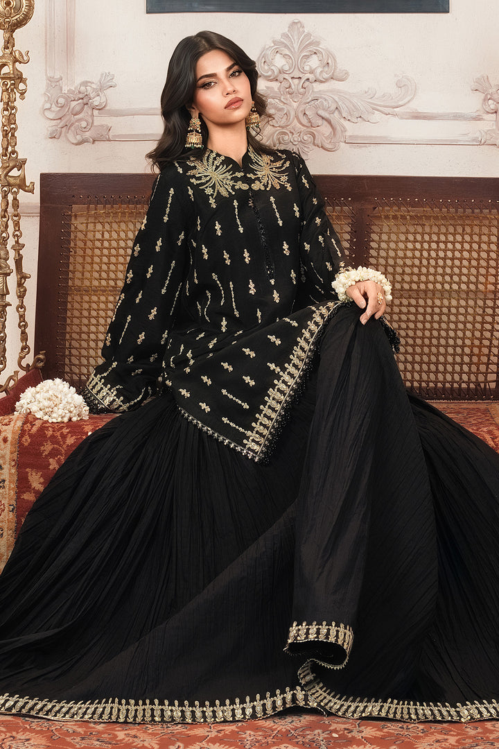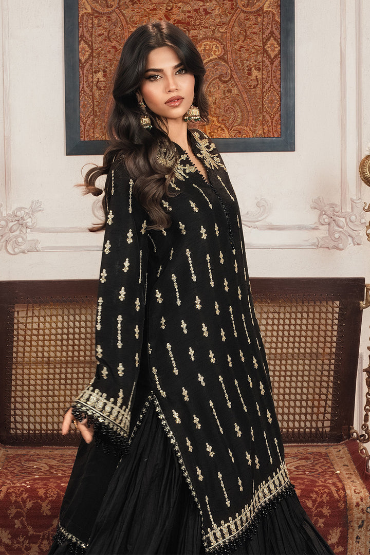 Make a statement with our two-piece embroidered raw silk ensemble featuring black beauty color tones with shinny sequenced embroidery.
