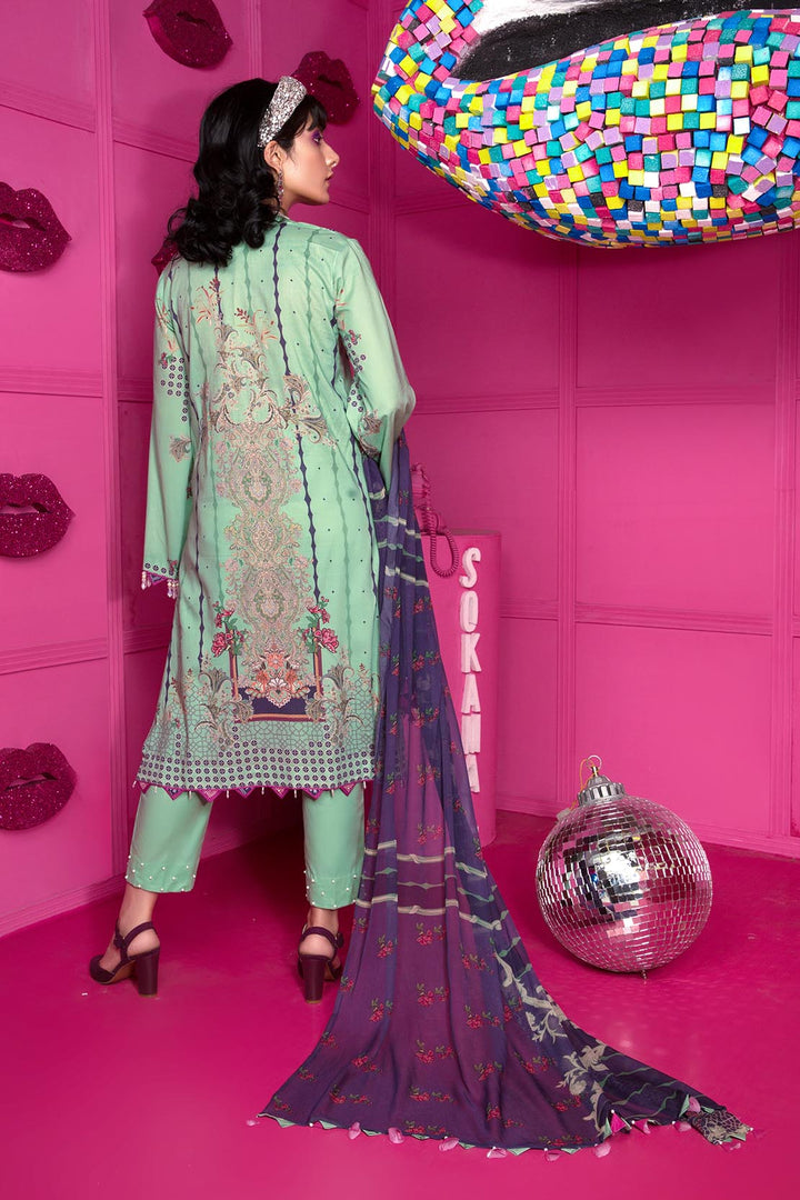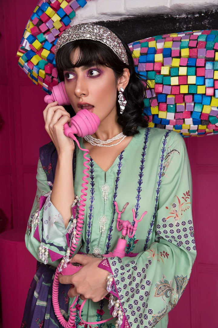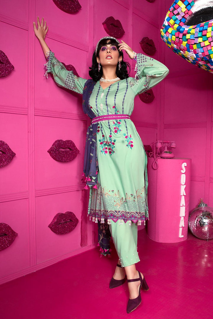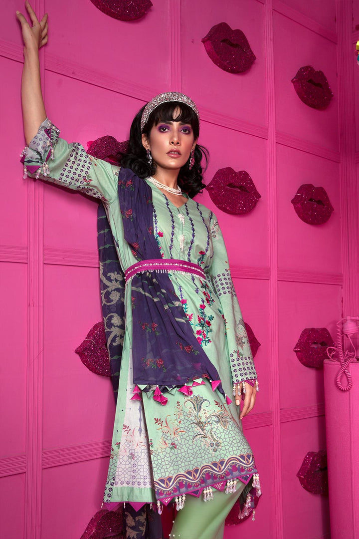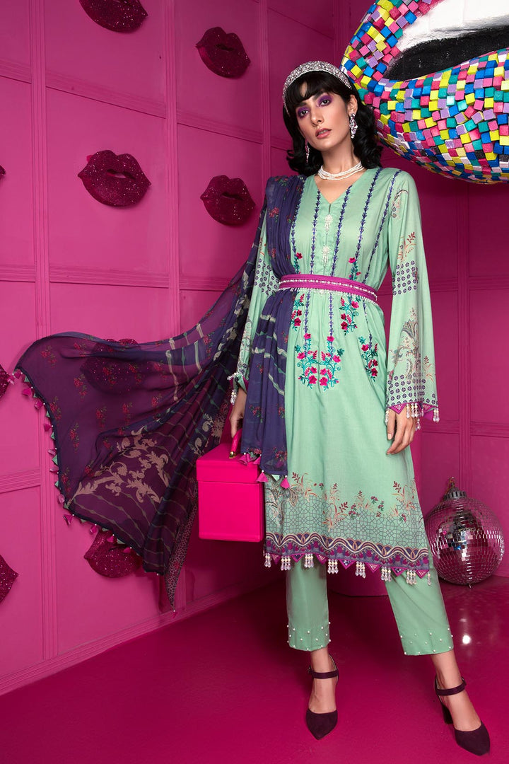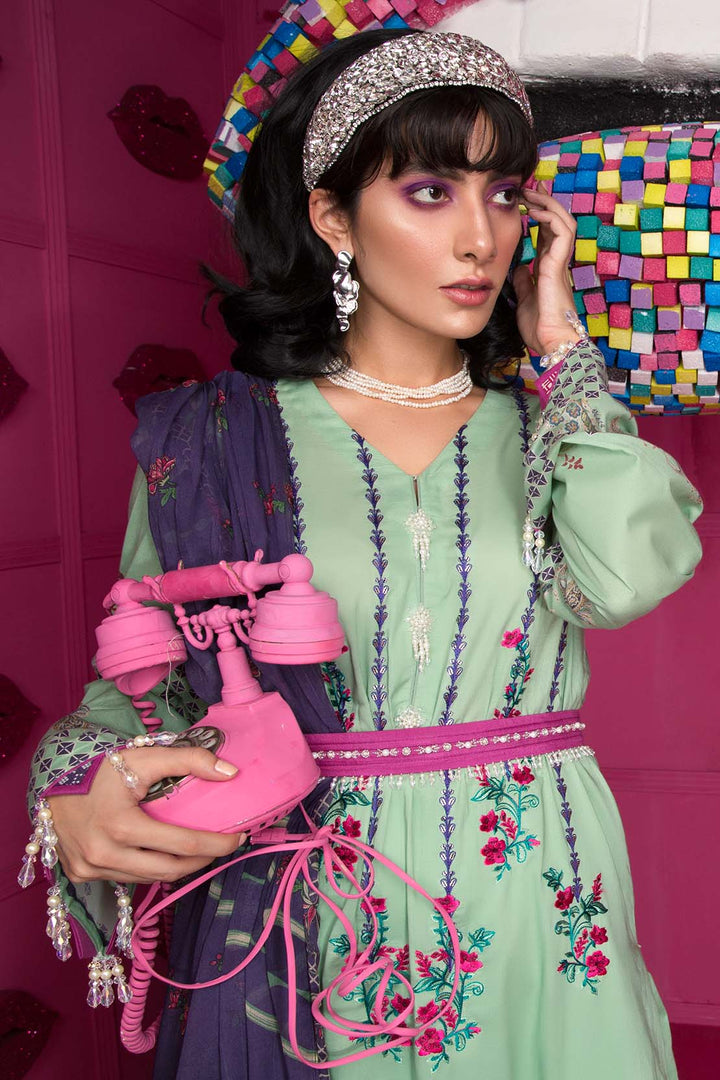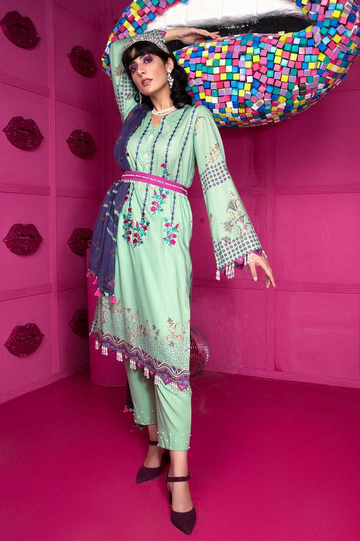 Mint color canvas with a fusion of victorian swirls with colorful floral imagery is paired with violet printed Chiffon dupatta.