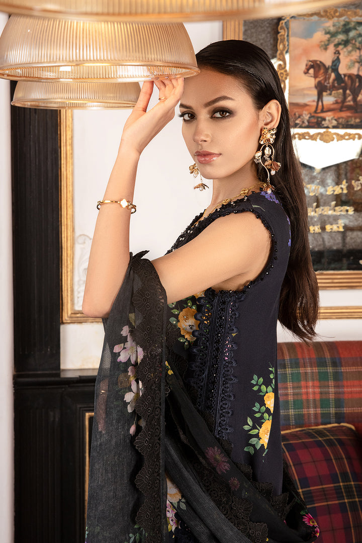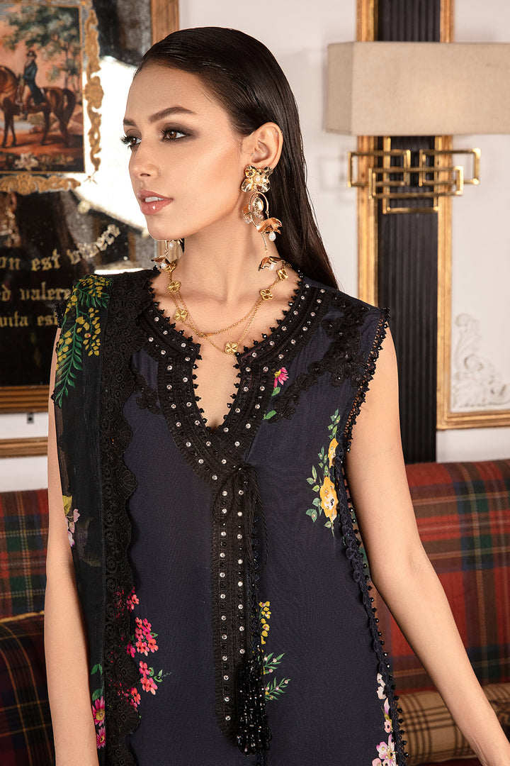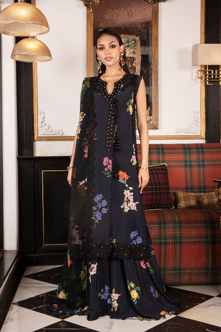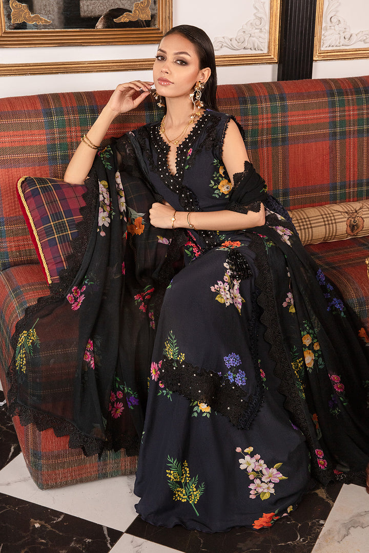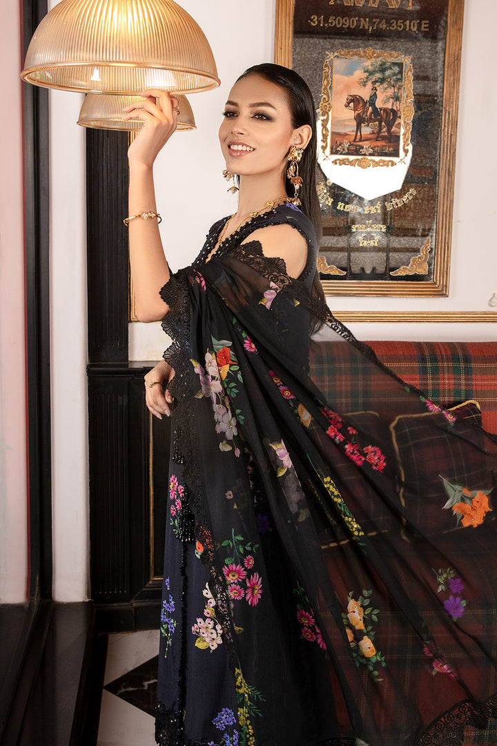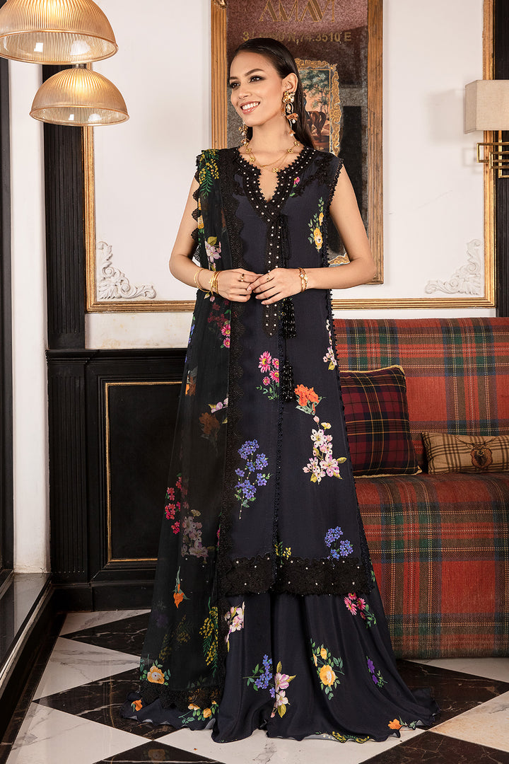 A playful fusion of colours take place in this grip set which features floral imagery on a charcoal black canvas, adorned with self-color embroidered neckline, motifs, border along with the details of hand embellishment of crystals and swarovski’s. The front motifs are enhanced with colorful stones to create a 3D look. Paired with same digitally printed grip pants and matching chiffon dupatta making this a perfect choice.