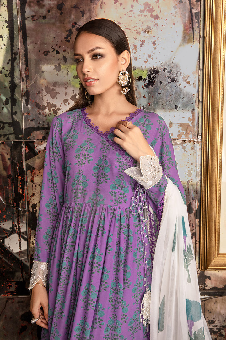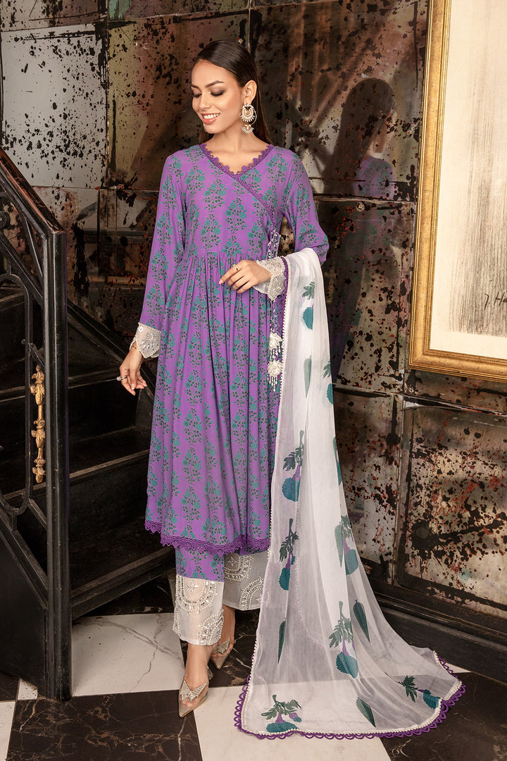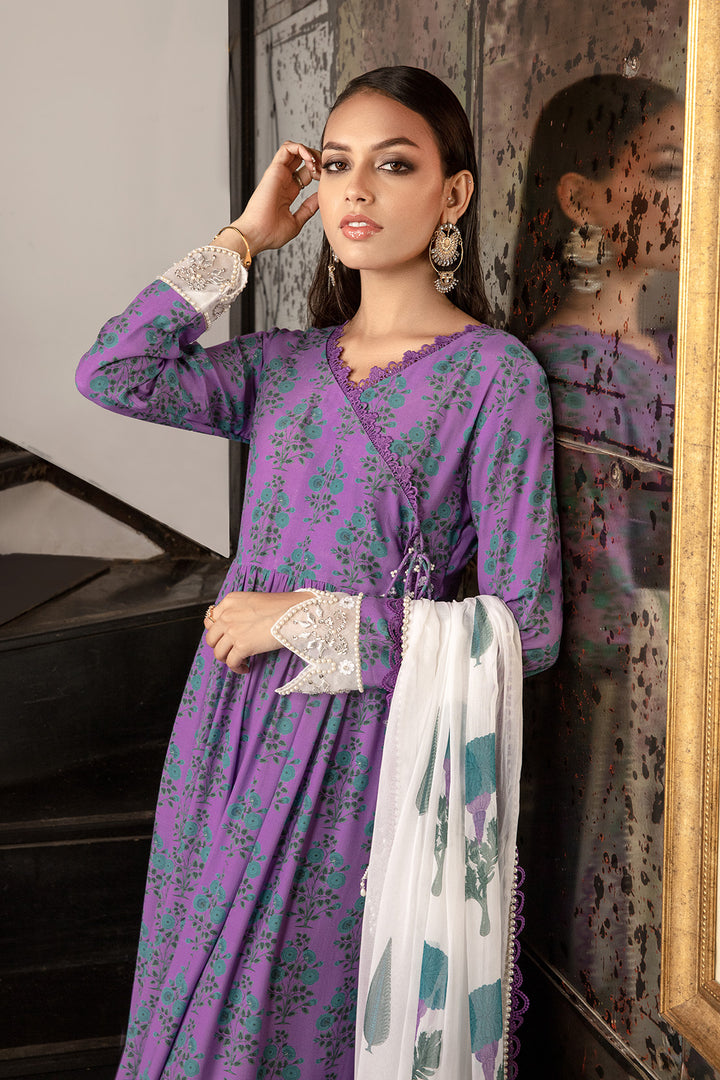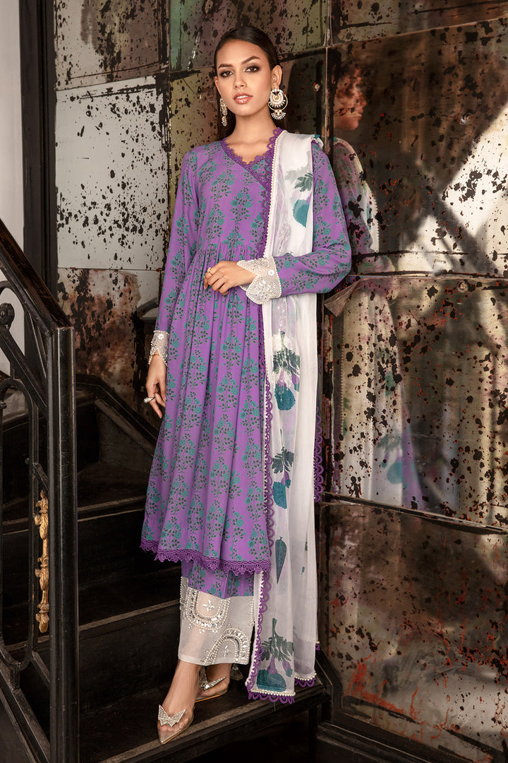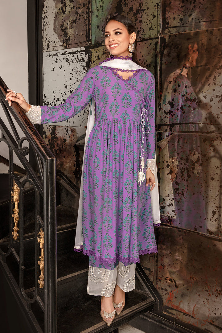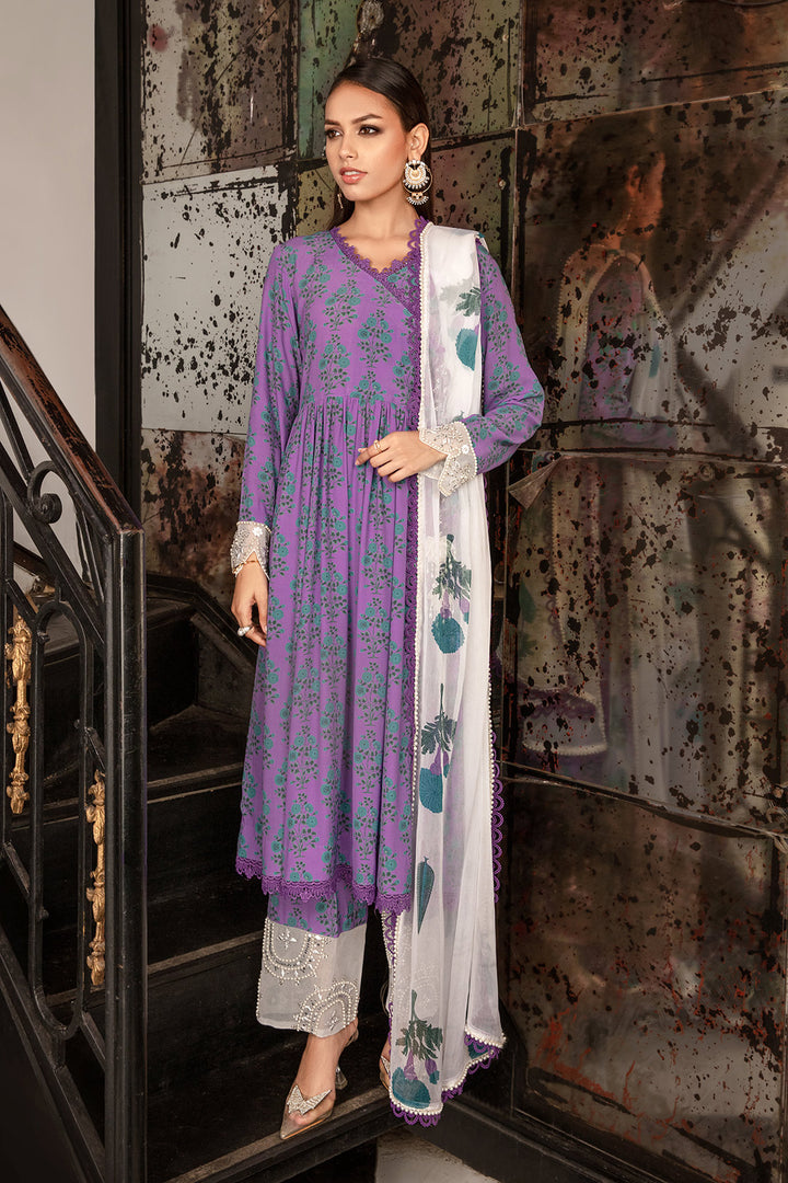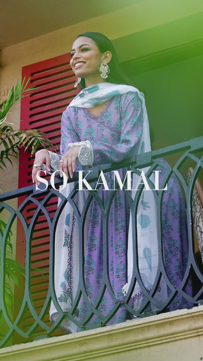 This subtly sophisticated purple grip set features signature Mughal fresco motifs in shades of sea green. The ensemble is paired with same digitally printed grip pants and a chiffon digitally printed contrasting dupatta inspired with kalamkari motifs in colors of purple, sea green and white. This set includes hand embellished borders with gotta patti, crystals, sequins and pearls for sleeves and trousers.