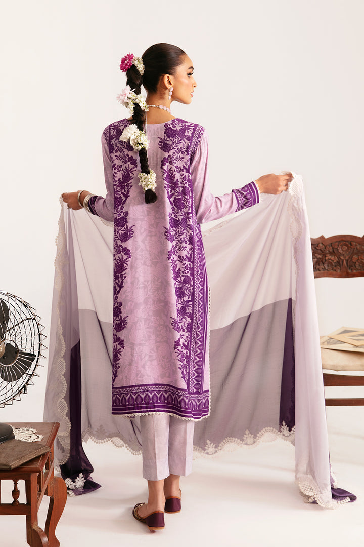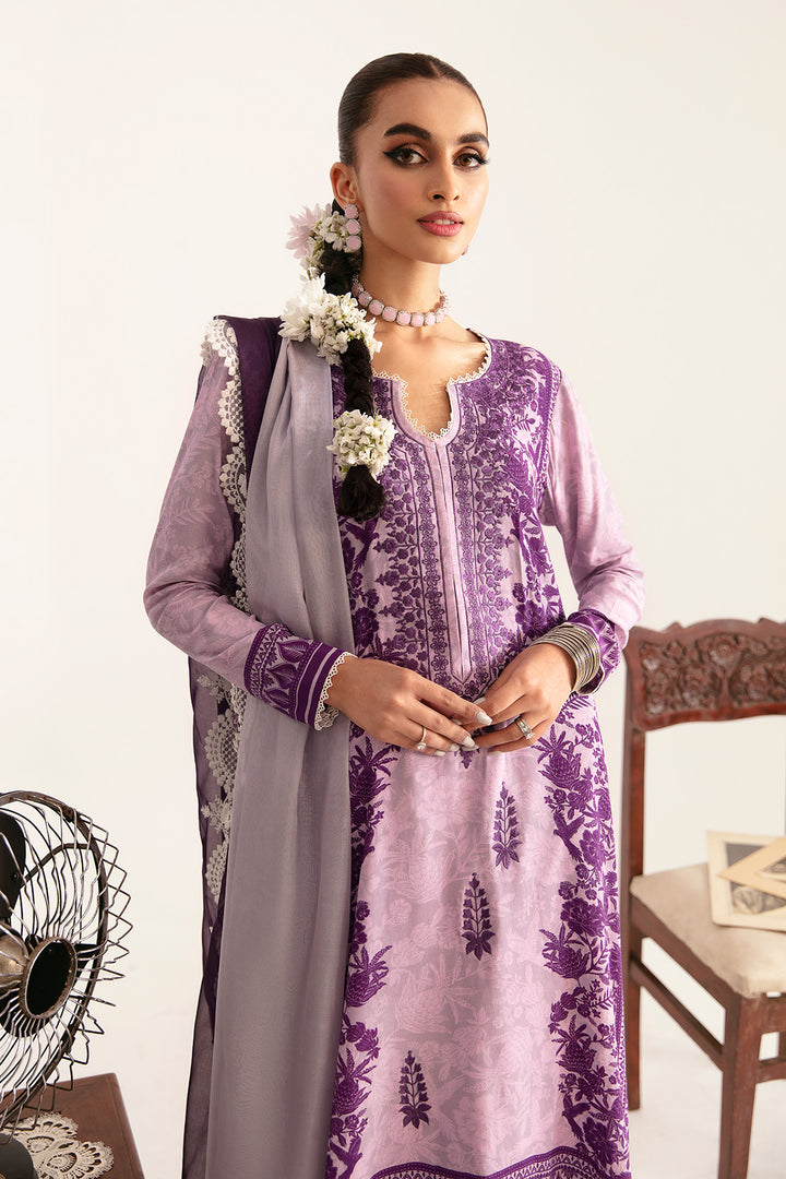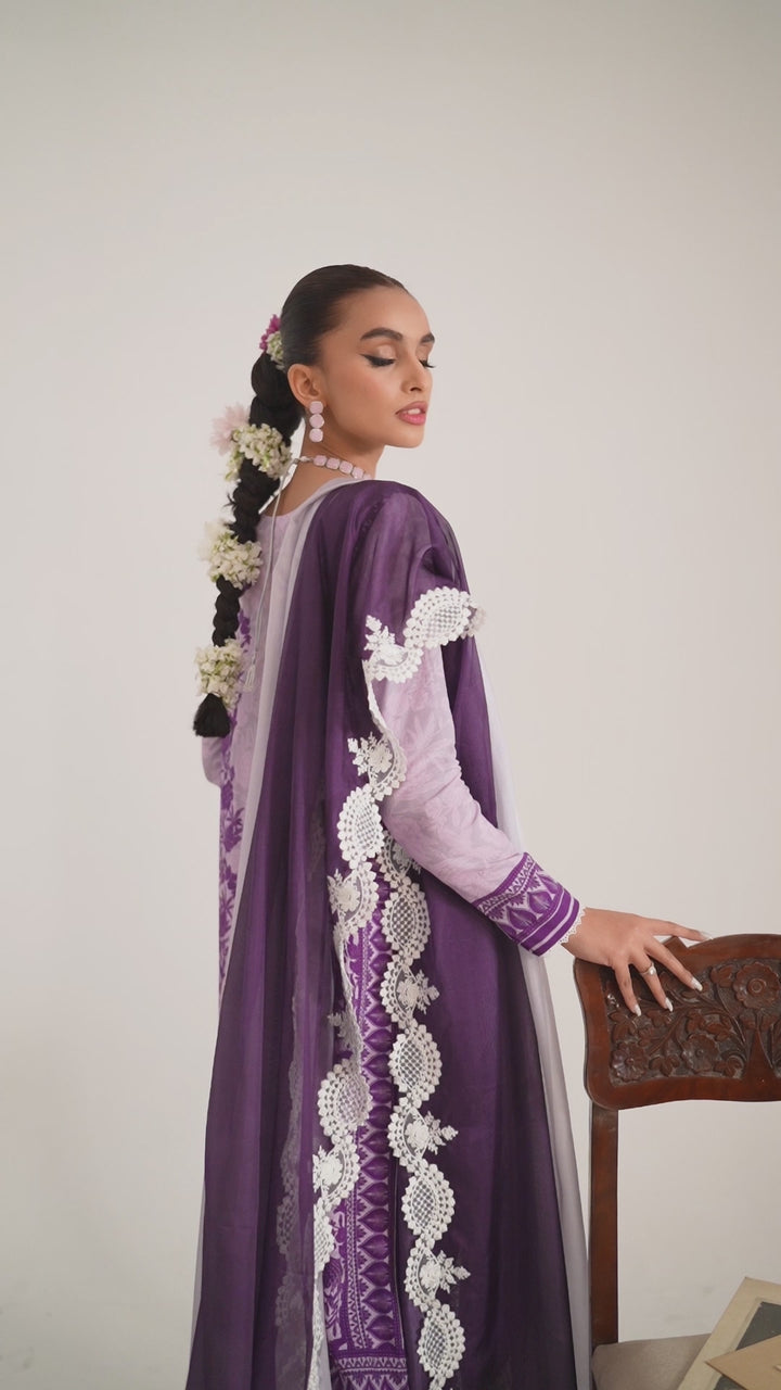 Set against breezy shades of lilac and purple, this digitally printed grip shirt is elegantly rendered with aari technique embroidery, embodying the essence of So Kamal. this look is completed with a color block paper silk heavily embroidered border dupatta and same color digitally printed grip pants.