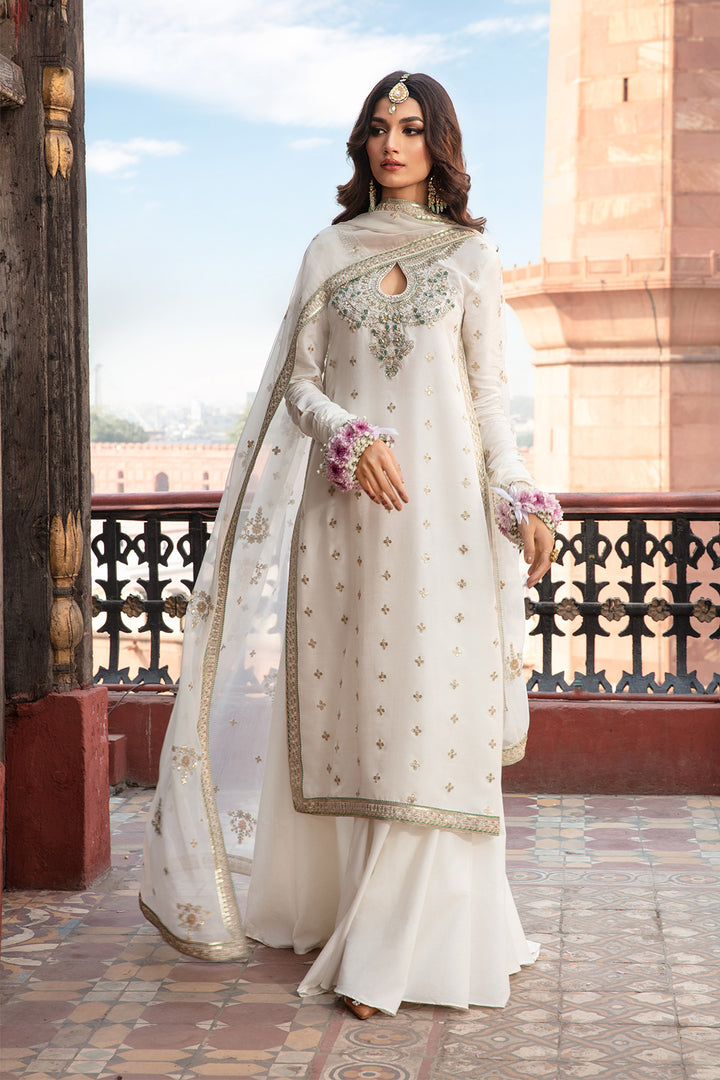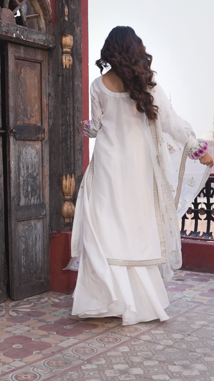 An elegant pearl white raw silk shirt features an intricately and heavily embroidered front, with borders for side slits and fully embroidered sleeves. The shirt resides a beautifully hand embellished neckline adorned by pearls, crystals, heightened with gorgeous details of french knots and zardozi work. It is paired alongside a khadi lawn flared lehnga. The look is finished with an embroidered chiffon dupatta accented by borders. Perfect for a day wedding.